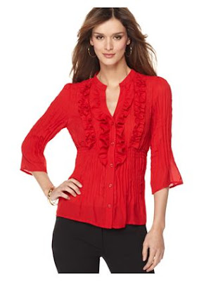 NY Collection Top, V-Neckline Three Quarter Bell Sleeves Crinkled Ruffled Button Down. |