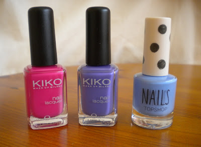I was in Rome at the weekend and we came across a Kiko Milano shop one of the days where I picked up a couple of their nail polishes. I'd only briefly heard of this brand before but I thought the nail polishes looked quite impressive and they had a huge range of shades! I got #'s 313 (hot pink) and 332 (purple). They were also a huge bargain at €2.50 each! I also bought a Topshop nail polish before I left in the shade Celestial which is a gorgeous cornflower blue. I love Topshop nail polishes - they always have great colours, they're opaque in two coats and are very easy to apply! Swatches below are all two coats.